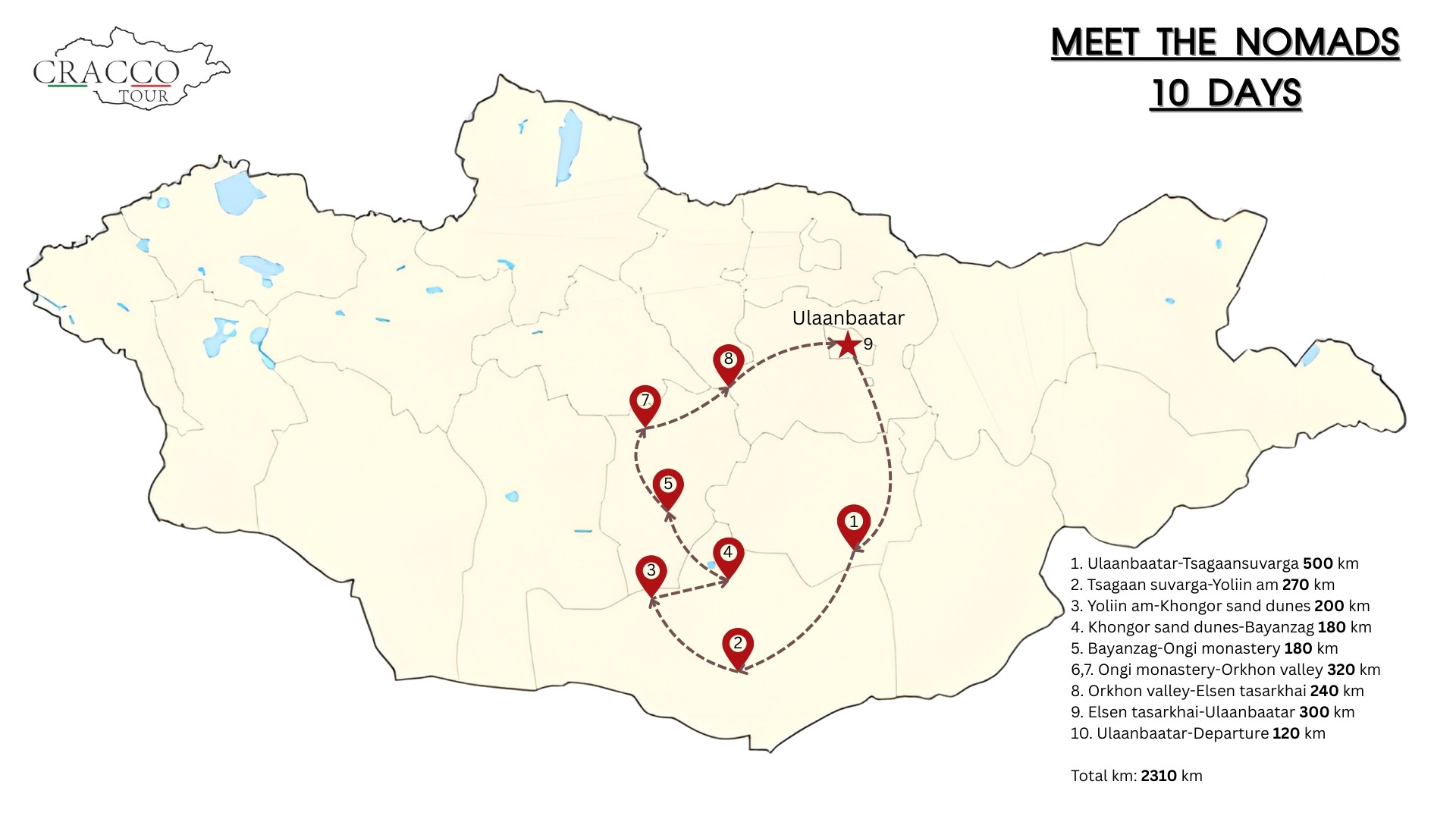 - Accommodation: Hotel, ger camp, tented camp